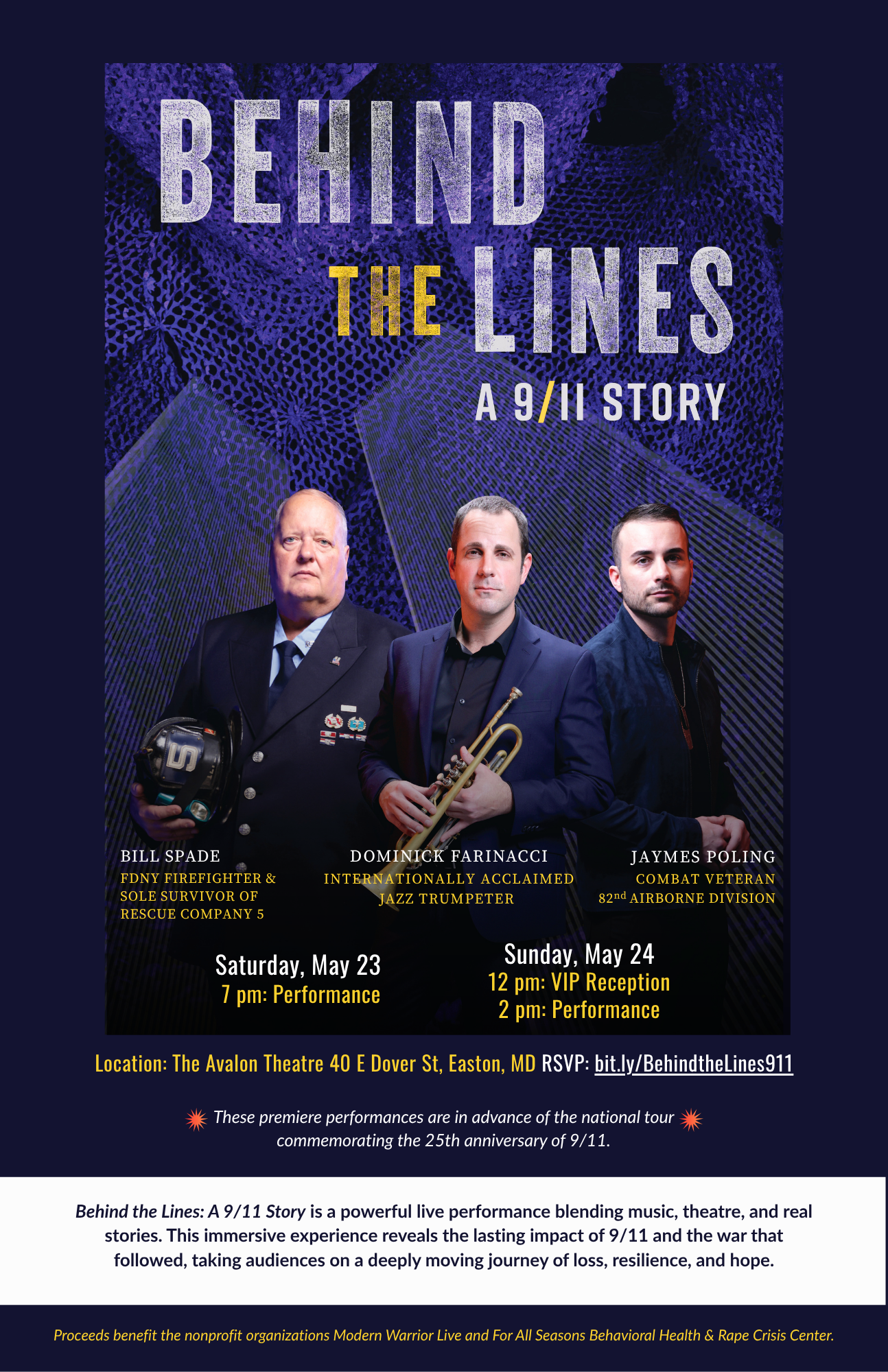 Two Performances at the Avalon Theatre in Easton, MD: Saturday, May 23rd, 7 PM Sunday, May 24th, 2 PM To purchase tickets, visit: bit.ly/BehindtheLines911 9/11 drew a nation together and forever linked the lives of two men from different generations. Set against the tragedy of the attacks and the war that followed, Behind the Lines:…