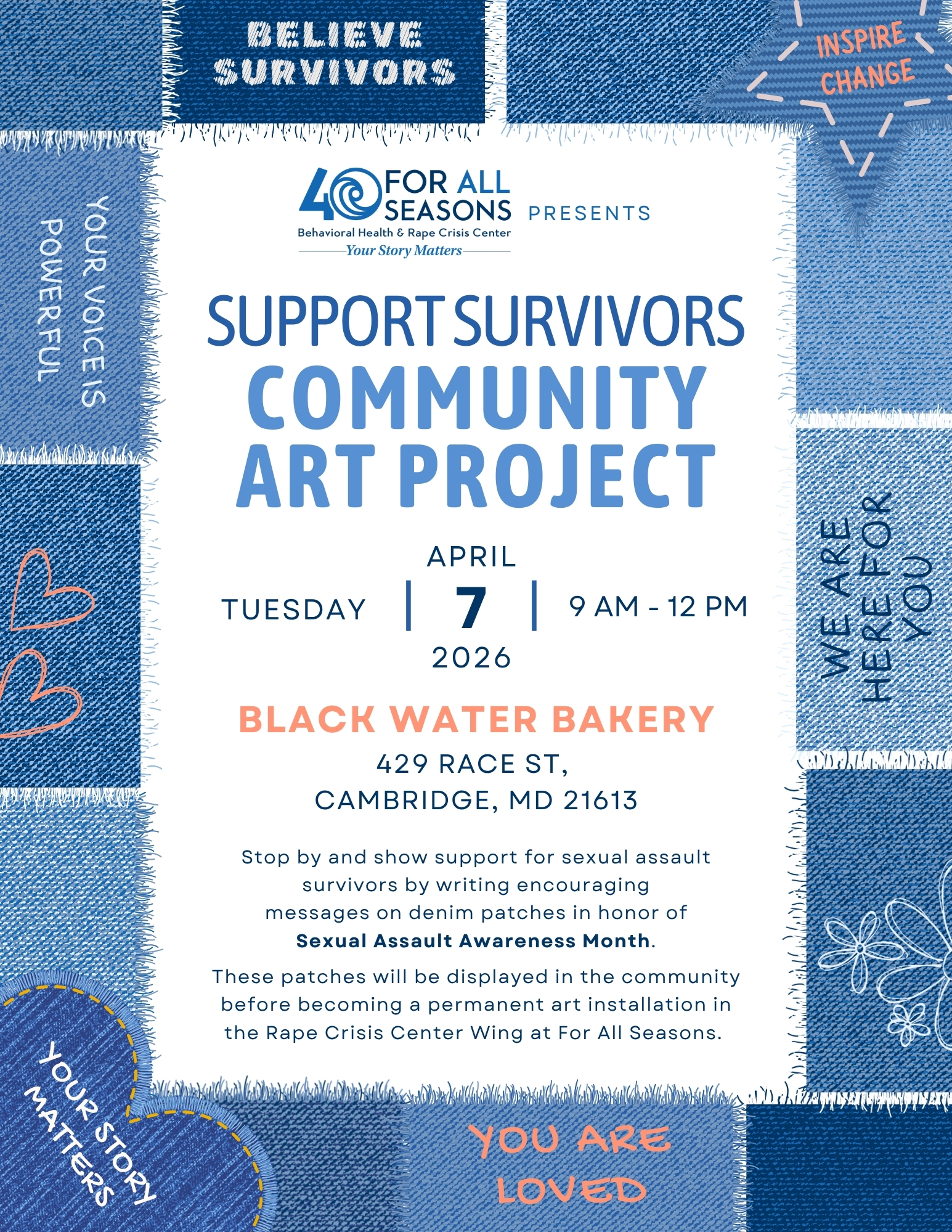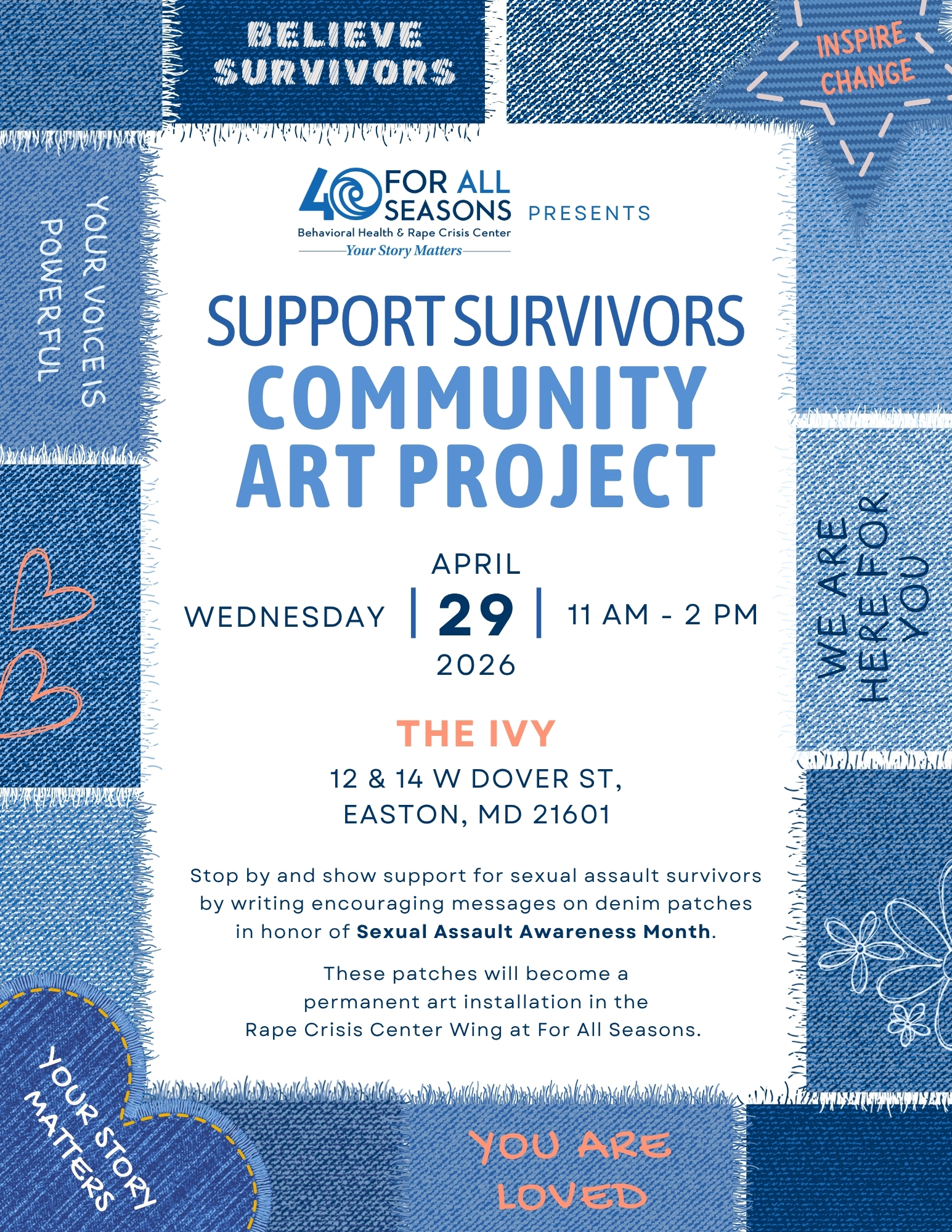 Stop by Dessert First in Grasonville and help For All Seasons’ Rape Crisis Center show support for sexual assault survivors by writing encouraging messages on denim patches in honor of Sexual Assault Awareness Month. These patches will be displayed in the community before becoming a permanent art installation in the Rape Crisis Center Wing at…